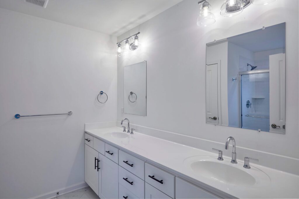 Maple vanities with cultured marble countertop with integral sink (dual adult height in owner’s bath)