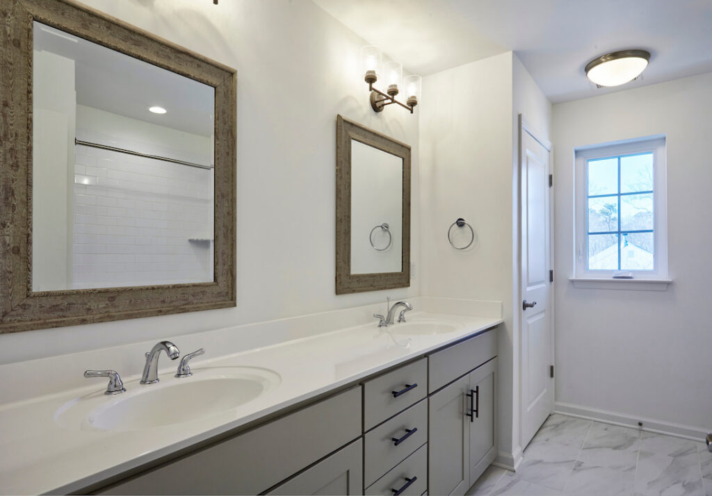 Maple vanities with cultured marble countertop with integral sink (dual adult height in owner’s bath)