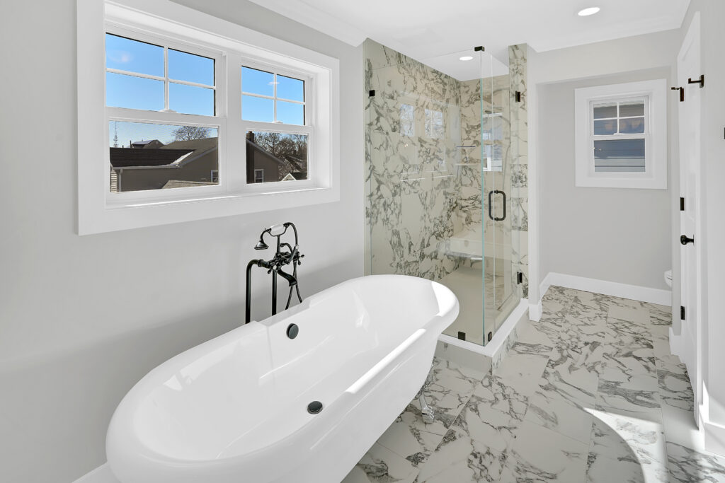 - Large primary bedroom with a walk-in closet featuring a custom closet system and a custom tile bathroom with a freestanding clawfoot tub