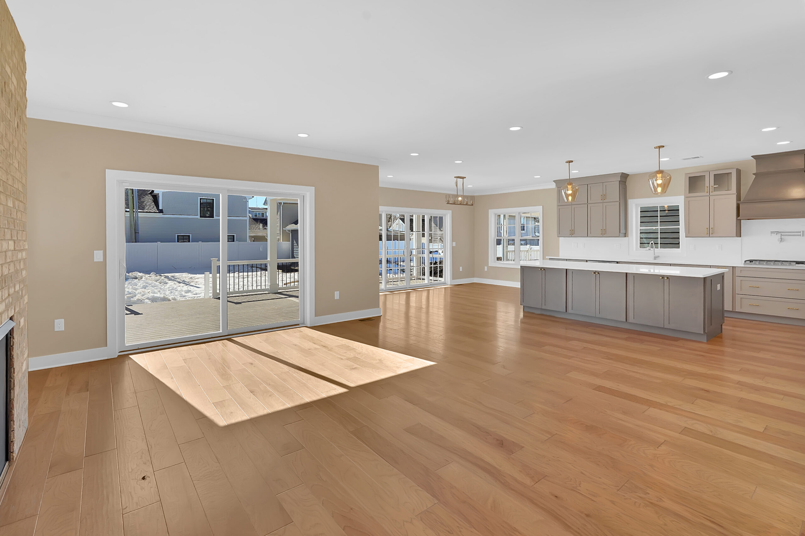 - Custom decking with white composite rails and aluminum balusters, soffit, and wrapped columns (front and rear)