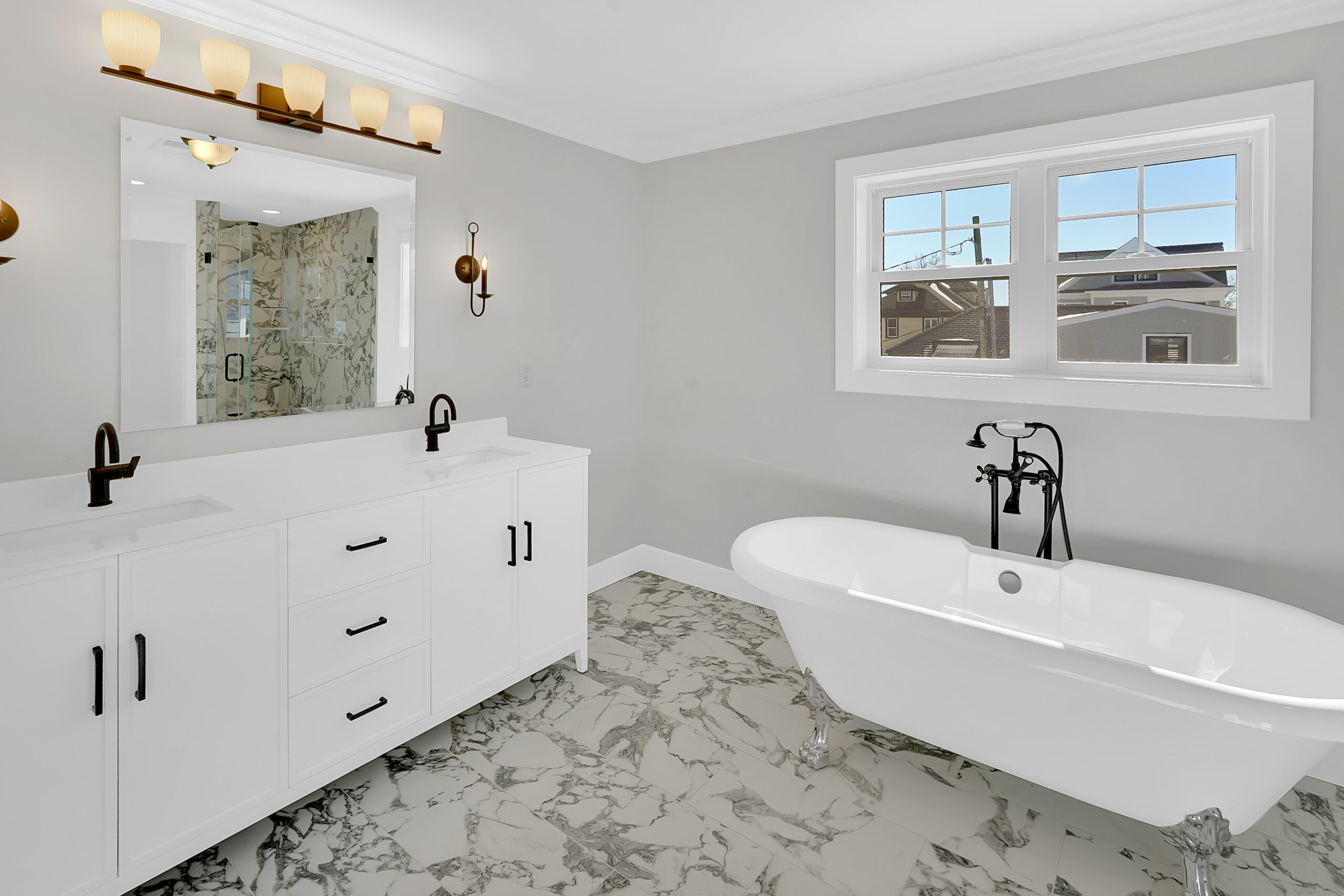 - Large primary bedroom with a walk-in closet featuring a custom closet system and a custom tile bathroom with a freestanding clawfoot tub